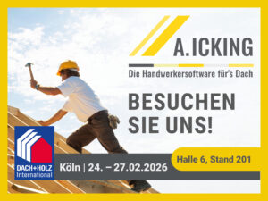 Vom 24. bis 27. Februar 2026 öffnet die DACH+HOLZ International erneut ihre Türen in Köln – die Leitmesse für Dachdecker, Zimmerer, Klempner und das gesamte Holzbau-Handwerk. Auch wir von A. Icking sind wieder mit dabei und freuen uns darauf, die nächste Generation unserer Handwerkersoftware vorzustellen – mit besonderen Schwerpunkten auf unserer Software für Dachdecker und Zimmerer.